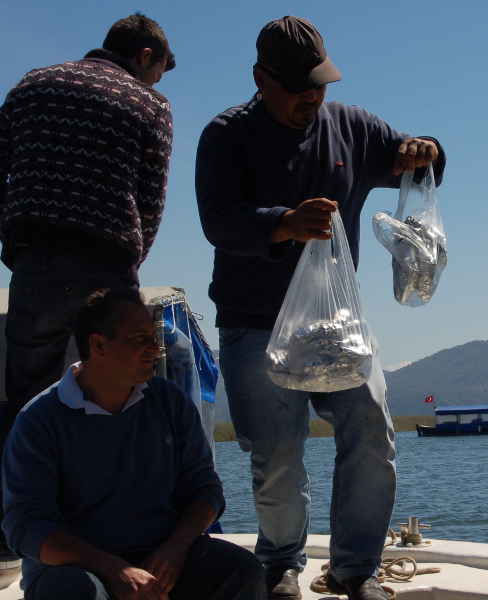 Türkisches Frühstück um 7:00 Uhr und eine Stunde später waren wir durch die Berge unterwegs zum Ort Dalyan am gleichnamigen Fluss, der aus den nahegelegenen Bergen aus dem Köycegiz Göyü seinen kurzen Weg ins Meer beginnt. Der Köycegiz Göyü ist ein See, der seinerseits aus diversen Bächen aus den Bergen gespeist wird. Ebene, die er Fluss bis zum Meer durchwandert ist sumpfig und von viel Schilf bewachsen. Davon konnten wir auf der Flussfahrt allerdings nur eine Ahnung bekommen, weil auch hier ende März das meiste Grün noch überwiegend in den Startlöchern steckt. Wir hatten inzwischen Lykien verlassen und bewegen uns jetzt in der Landschaft Karien. Vor dem Ort wartete eine Flotte von Ausflugsbooten. Die Zeit am Vormittag war, wie wir bald feststellen sollten optimal für die Besichtigung der Felsengräber, die nicht weit vom Ort an einem nach osten abfallenden Felshang liegen und jetzt wunderbar von der Morgensonne beleuchtet wurden. Doch zuerst ging es flussabwärts am Ort Dalyan vorbei. |