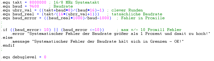 Die Quarzfrequenz wird dem Assembler bekanntgegeben und die gewünschte Baudrate genannt. Die nächsten drei Zeilen dienen dem Berechnen des Teilers der Systemfrequenz für das Einstellen der Baudrate. Grundlage ist eine Ganzzahlarithmetik, es gibt also keine Kommastellen. Dieses Rechnen mit ganzen Zahlen zwingt zu einigen Tricks, wenn man auf die Segnungen der Berechnung mit Fließkommazahlen - z. B. Runden - nicht ganz verzichten will. Die zugrunde liegende Formel stammt aus dem Datenblatt des Tiny2313, Seite 118, Tabelle 48.