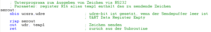 Die Senderoutine ist kurz und leicht überschaubar. UDR ist das Register, in das zu sendende Daten geschrieben werden müssen. Im Register temp1 muss da zu sendende Byte übergeben werden. Sobald das Senderegister UDR beschrieben ist, beginnt der USART mit dem Hinausschieben der Bitinformation über die TXD-Leitung. Ob das Senderegister frei ist, sagt uns das Bit UDRE (UDR Empty) im UCSRA-Rgister. Die internen Speicherstellen für das Senderegister UDR und das Empfangsregister UDR sind verschieden aber von der Adresslage her identisch. In das Senderegister kann nur geschrieben, aus dem Empfangsregister nur gelesen werden.