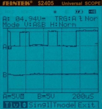 Im Ruhezustand (idle) liegt die Sendeleitung auf -12V, was einer logischen 1 (TTL-Pegel 5V) im AVR entspricht. Will der Sender ein Byte übermitteln, legt er die Sendeleitung für die Dauer eines Bits auf +12V, was dem TTL-Pegel 0V und dem Logikpegel 0 entspricht. Man beachte, dass die Zeitachse in der folgenden Darstellung nach rechts verläuft, und die Zeitwerte in dieser Richtung größer werden. Daher sind zeitlich früher liegende Ereignisse weiter links und später auftretende Ereignisse weiter rechts angeordnet. Die Bitfolge des zu sendenden Bytes wird dadurch scheinbar umgekehrt. Dieses Bild ergibt sich so auch auf dem Oszilloskop. Das Startbit |_| (Kanal A) dauert ca. 100 µs.