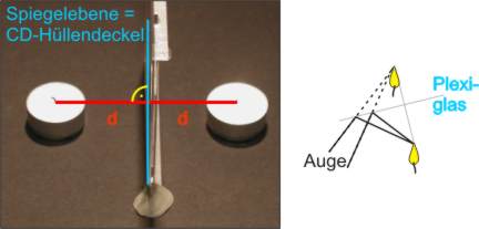 Befinden sich die beiden Dochte exakt auf einer Senkrechten zur Spiegelebene aus dünnem Plexiglas und sind die Abstände d genau gleich, dann hat man, von rechts beobachtend, den Eindruck, dass auch die gelöschte Kerze brennt. Ein Teil des Lichts vom rechten Docht wird am Plexiglas reflektiert. Das Licht scheint für den Beobachter von der virtuellen Lichtquelle (linke Kerze) her zu kommen. (siehe Skizze).