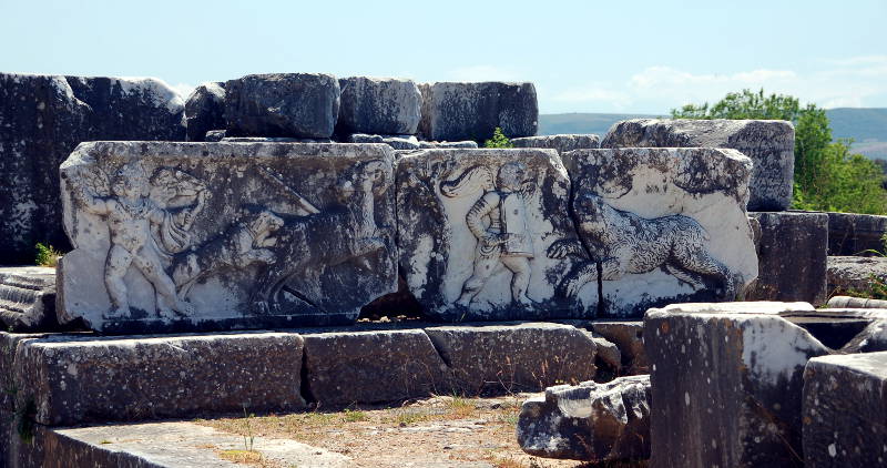 Löwenkopf in Marmor im Trümmerfeld vor dem Theater von Milet
