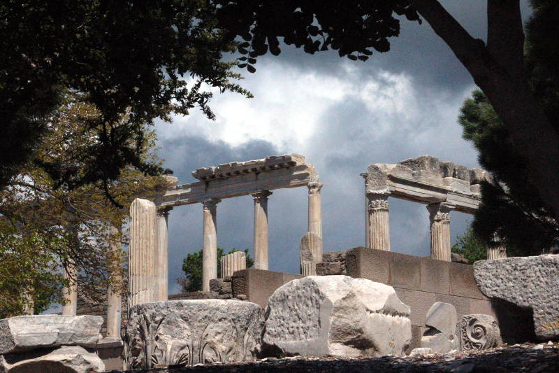 Teile der Giebelkonstruktion des Trajanstempels - im Hintergrund die Säulen