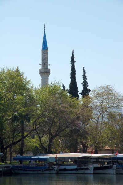 Türkisches Frühstück um 7:00 Uhr und eine Stunde später waren wir durch die Berge unterwegs zum Ort Dalyan am gleichnamigen Fluss, der aus den nahegelegenen Bergen aus dem Köycegiz Göyü seinen kurzen Weg ins Meer beginnt. Der Köycegiz Göyü ist ein See, der seinerseits aus diversen Bächen aus den Bergen gespeist wird. Ebene, die er Fluss bis zum Meer durchwandert ist sumpfig und von viel Schilf bewachsen. Davon konnten wir auf der Flussfahrt allerdings nur eine Ahnung bekommen, weil auch hier ende März das meiste Grün noch überwiegend in den Startlöchern steckt. Wir hatten inzwischen Lykien verlassen und bewegen uns jetzt in der Landschaft Karien. Vor dem Ort wartete eine Flotte von Ausflugsbooten. Die Zeit am Vormittag war, wie wir bald feststellen sollten optimal für die Besichtigung der Felsengräber, die nicht weit vom Ort an einem nach osten abfallenden Felshang liegen und jetzt wunderbar von der Morgensonne beleuchtet wurden. Doch zuerst ging es flussabwärts am Ort Dalyan vorbei. |