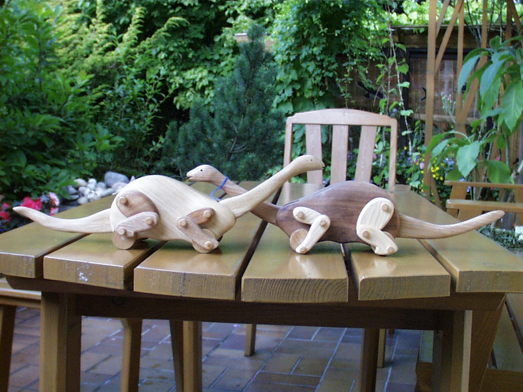 Die Räder hab ich einfach mit der Lochkreissäge hergestellt. Ich musste nur noch die Löcher auf 10 mm vergrößern. Damit die Achsen im Körper leicht beweglich sind braucht man Bohrungen von 11,5 bis 12 mm. Zu groß hat auch keinen Sinn, weil dann die Räder wackeln und das Schnappen nicht mehr richtig funktioniert. Dieser Nili ist 32 cm lang und wurde aus zwei Kieferleimholzplatten von 18 mm und einer zentralen Sperrholzschicht von 10 mm zur Stabilisierung aufgebaut. Zähne und Achsen sowie die Zapfen in den Vorderrädern sind aus Rundhölzern verschiedenen Durchmessers. Auch hier gilt: Proportionen wahren.Wer mölchte, kann auch noch ein Schwanzloch bohren und einen Lederstreifen als Wedel einkleben. Gebaut hab ich die Nilis übrigens von ca 5 cm bis 45 cm Länge und die Auflage beträgt insgesamt etwa 50 Stück. - Wie meinen Sie? Ich müsse wohl ein großes Haus haben für diesen Zoo? Nein, die meisten hab ich verschenkt oder getauscht.